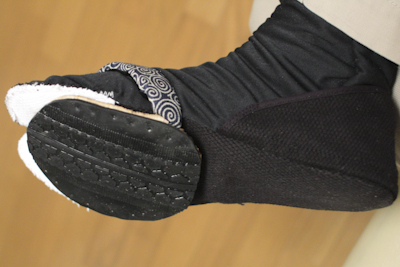 | わらじ掛け足袋を使って、足半を履いた様子です。 最初は素足より足袋や足袋型靴下を使うといいと思います。 外で履かれる場合も足袋との併用をオススメします。 |