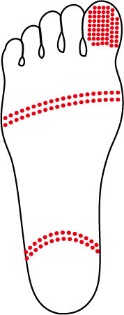 足裏には姿勢を制御するために必要な情報を収集する【メカノレセプター】と呼ばれる神経器官がたくさん点在しています。特に前足部(親指)・中足骨・踵の体重のかかりやすい部分に集中しています。